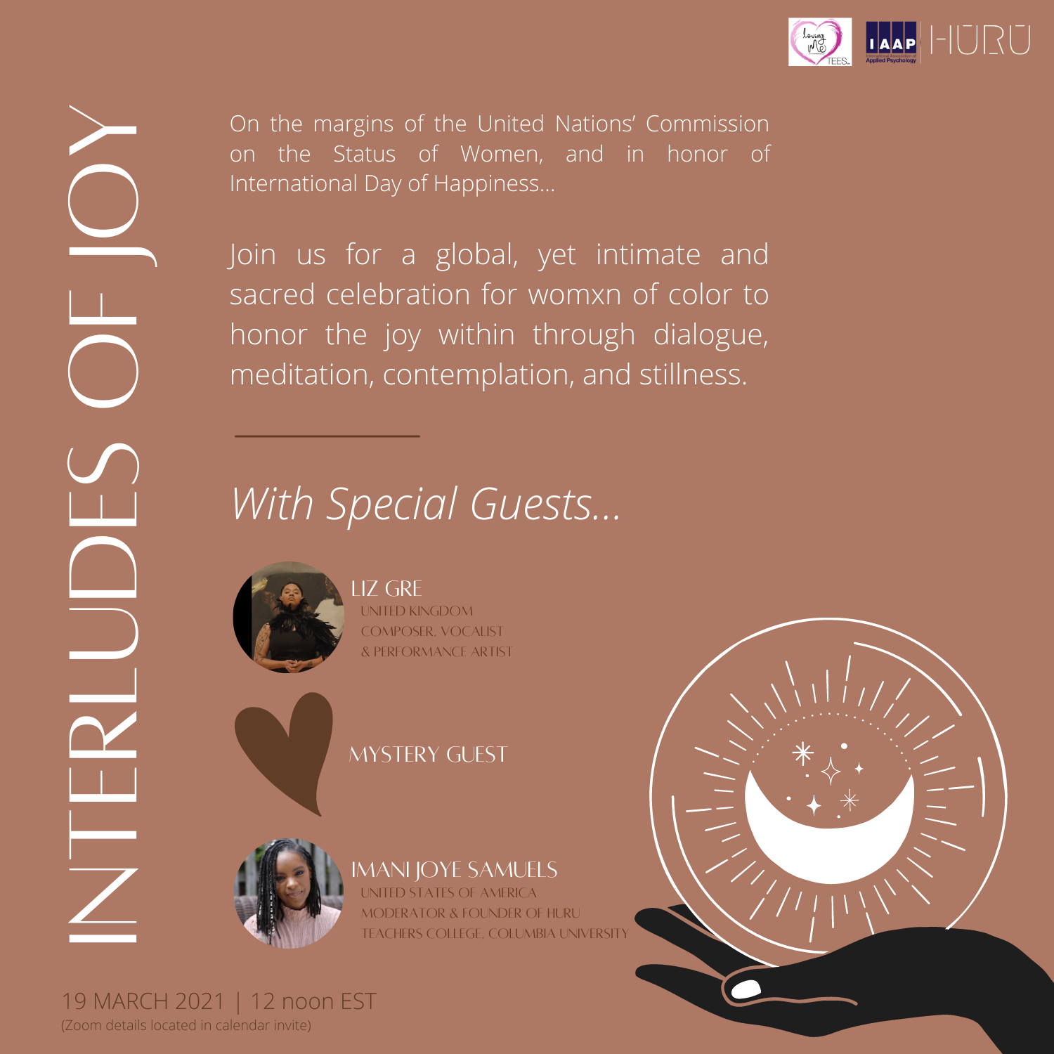 On the margins of the United Nations' Commission on the Status of Women, and in honor of the International Day of Happiness, join us for a global, yet intimate and sacred celebration of womxn of color to honor the joy within through dialogue, meditation, contemplation, and stillness.