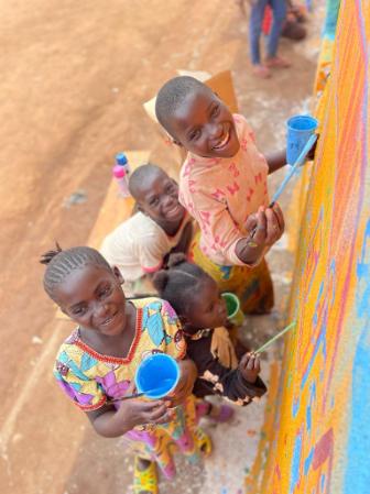 About this photo. Primary school students adding their own illustrations to the school mural with support and encouragement from local Artolution teaching artists