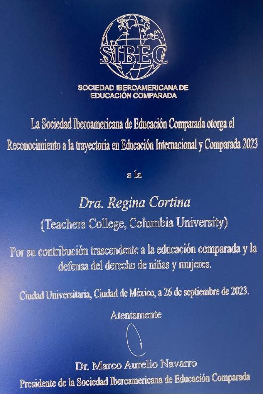 On Wednesday, September 27, 2023, Professor Regina Cortina in our International and Comparative Education program was recognized "for her transcendent contributions to Comparative Education and the defense of the rights of girls and women" at the IV Congress of the Sociedad Iberoamericana de Educación Comparada (SIBEC). The Congress took place at the National Autonomous University of Mexico (UNAM), in Mexico City.