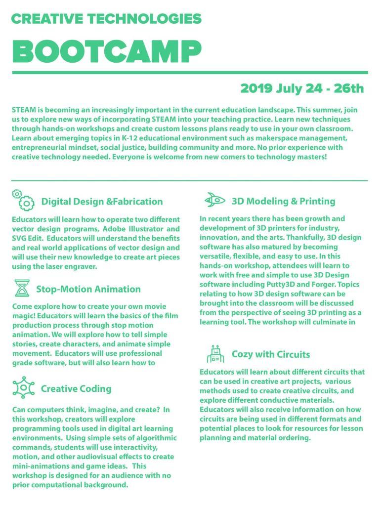 STEAM is becoming increasingly important in the current education landscape. This summer, join us to explore new ways of incorporating STEAM into your teaching practice. Learn new techniques through hands-on workshops and create custom lesson plans ready to use in your own classroom. Learn about emerging topics in K-12 educational environments such as maker space management, entrepreneurial mindset, social justice, building community, and more. No prior experience with creative technology is needed. Everyone is welcome from newcomers to technology masters!