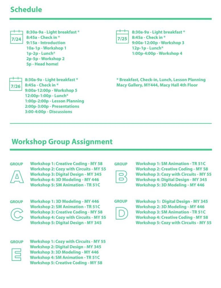 This will give them not only initial exposure to these new techniques but also a chance to have a hands-on exploration of the subject. For the first two days, educators will be attending two workshops, rotating between the different stations led by TC-specialized instructors. On the final day, they will spend the first half of the day attending their final workshop. In the last half of the day, they will meet their groups to discuss and formulate a lesson plan including one or more of the topics covered in the workshops. Each educator will create their own lesson plan for use in their classroom. Educators are encouraged to conference with each other and share ideas within their groups. At the end of the workshop not only will educators have some unique art pieces they have made, but also a set of lesson plans ready to be implemented in their own classrooms.