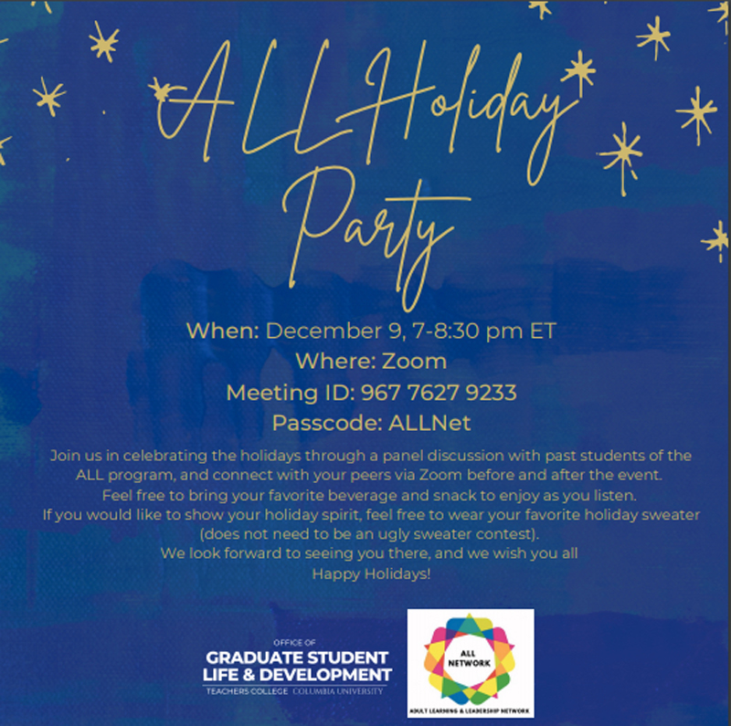 - ALL Holiday Party with Faculty & Alumni | Dec 7 @ 6pm EDT (Horace Mann 138)