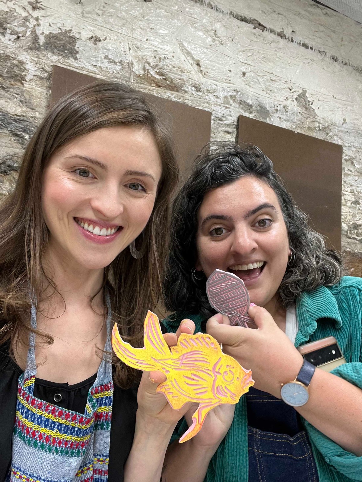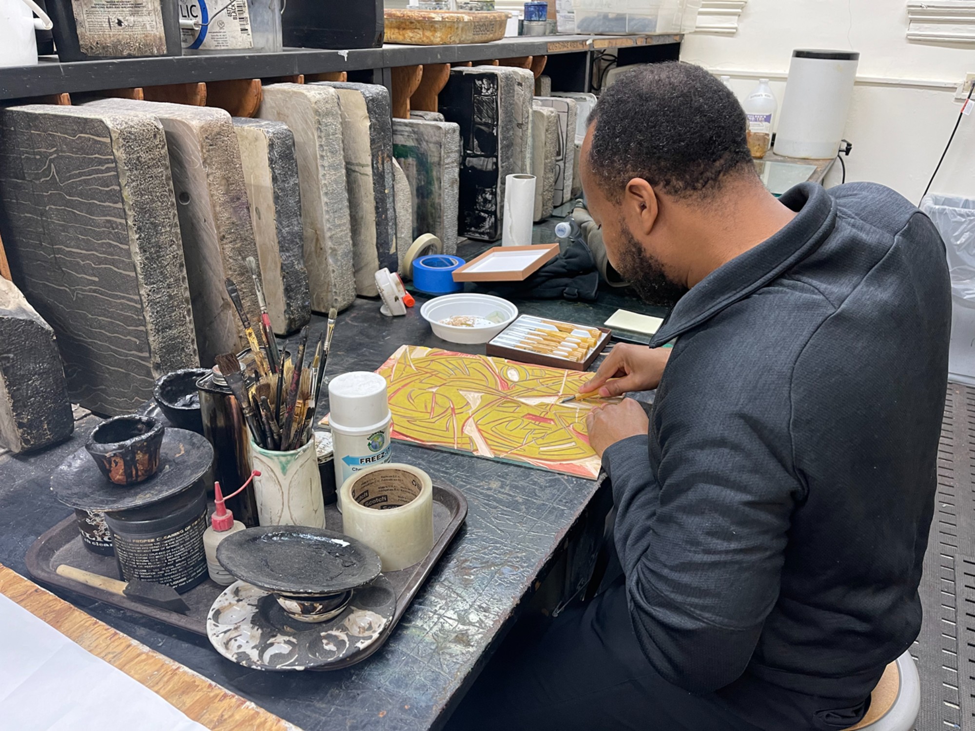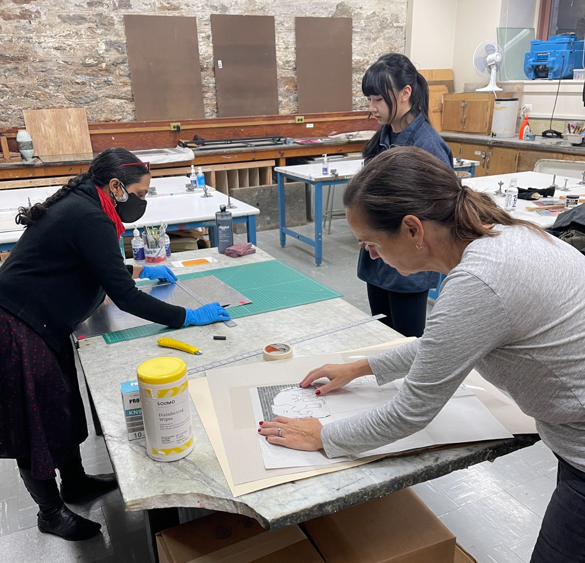 Along with the tangible skills learned through the process of printmaking, the studio prides itself in the ever evolving community from creating art in the same space. Everyone who participates in the studio is treated equally and encouraged to communicate with each other. Although materials have been individualized to adapt to current health and safety procedures, the communal use of space and natural curiosity for the exploration of printmaking are where camaraderie and sharing are naturally cultivated over time. Whether artists come to the studio for courses, studio use, or special lectures, each individual is treated with the same level of respect. Students and Community Artists are welcome to share their work with the other members including opening exhibitions, research inquiries, and other projects they are working on to show support for one another.