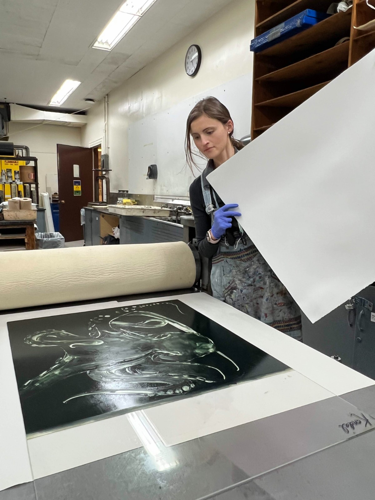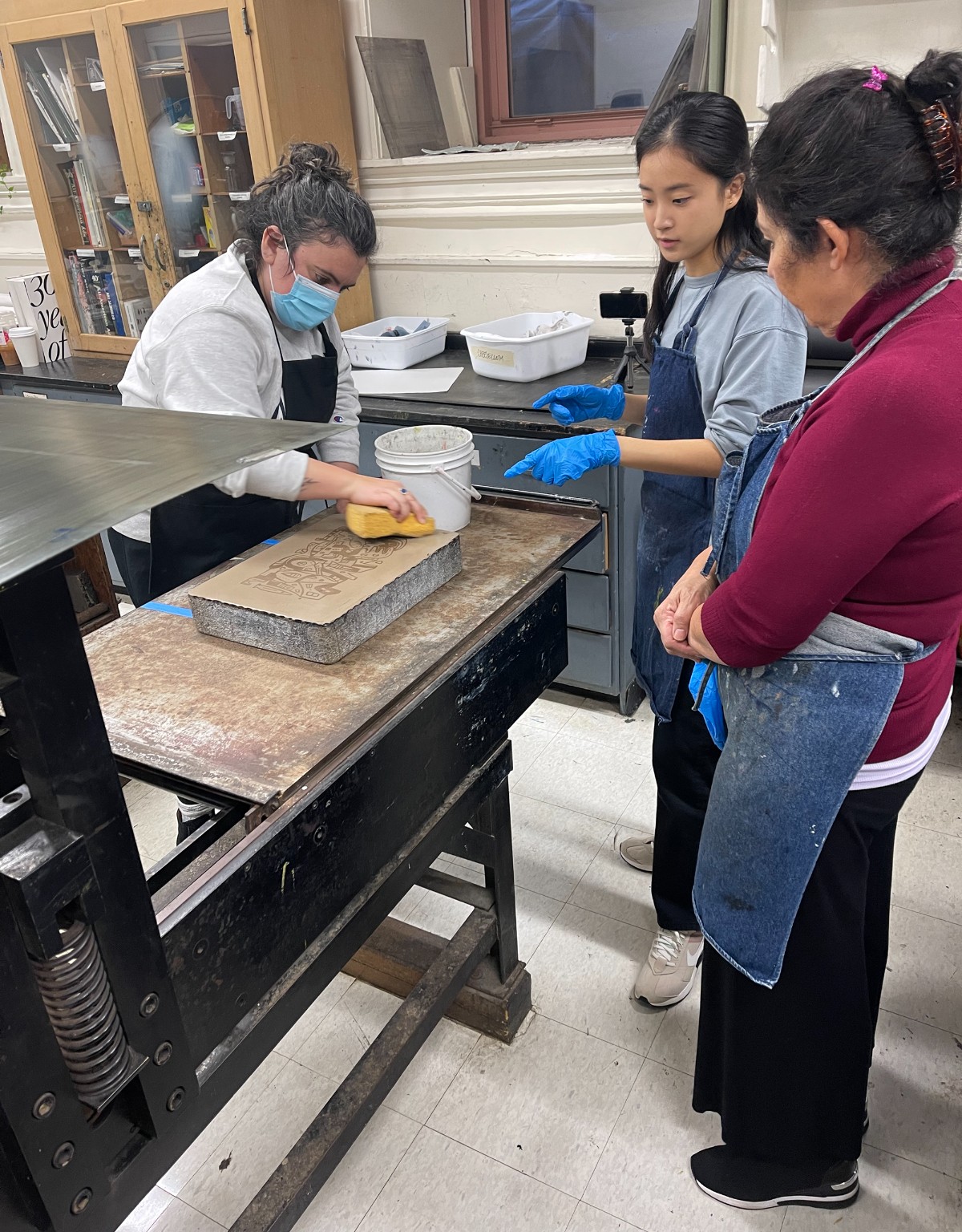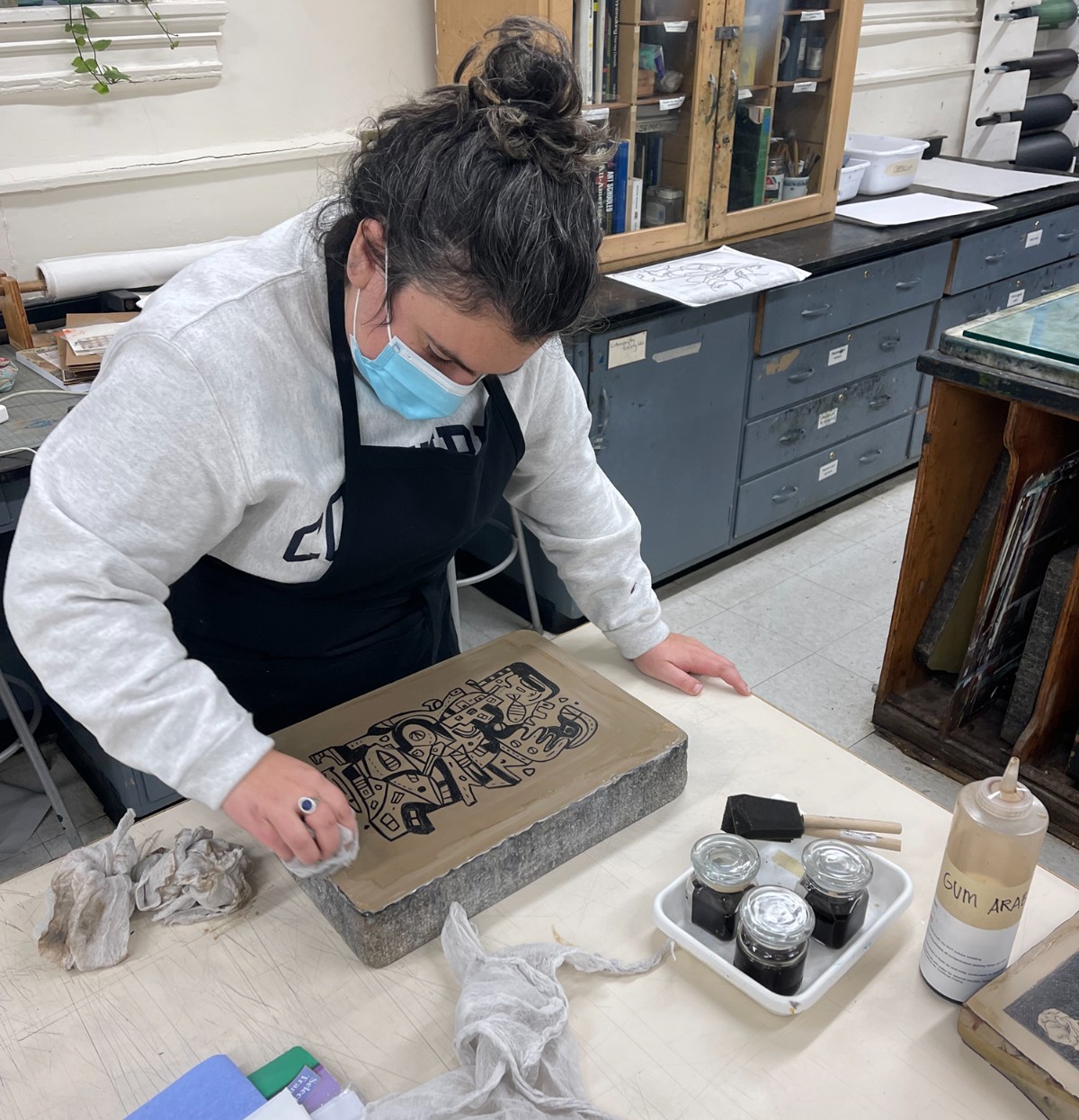 The studio’s rich community atmosphere is cultivated through multiple applications. Students are encouraged to learn from one another and collaborate through their experimentation in printing. Students are responsible to care for the studio space as if it were their own classroom and a space is given to them for their own personal artwork. Students engage in lively discussions through lectures, demonstrations, class critiques, and studio exhibitions.