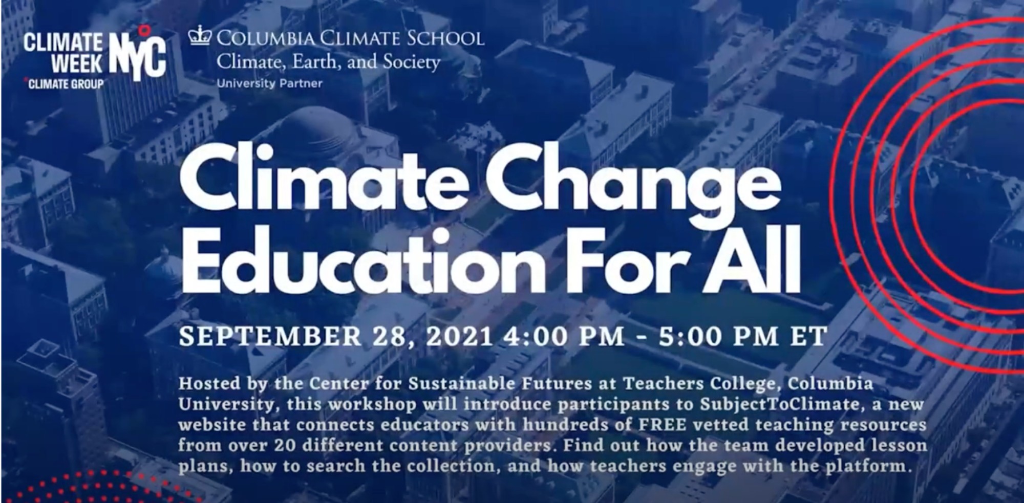 Hosted by the Center for Sustainable Futures at Teachers College, Columbia University, this workshop will introduce participants to SubjectToClimate, a new website that connects educators with hundreds of FREE vetted teaching resources from over 20 different content providers. Find out how the team developed lesson plans, how to search the collection, and how teachers engage with the platform.