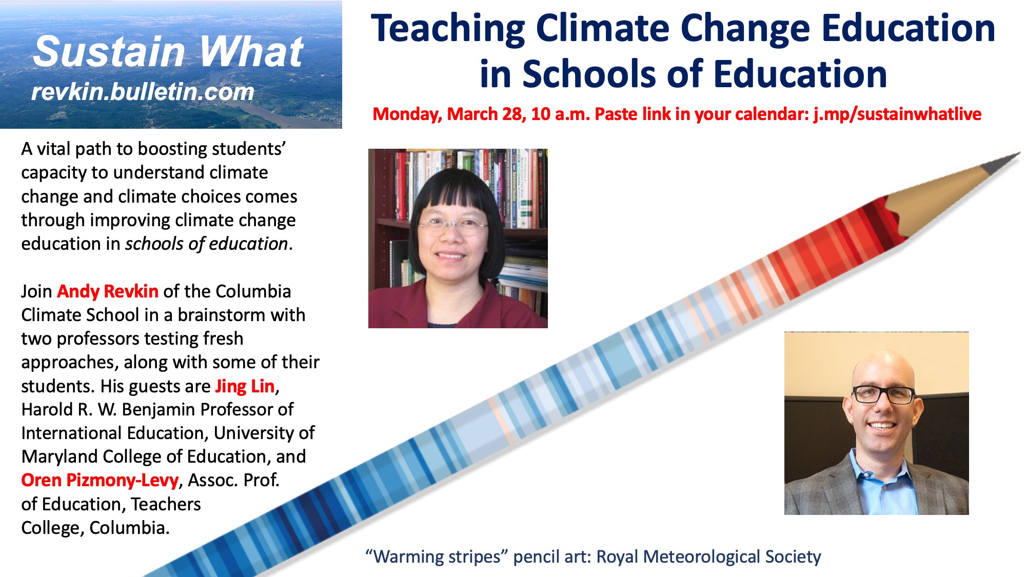 Andy Revkin of the Columbia Climate School tested fresh approaches to Climate Change Education, with Professor Jing Lin and Professor Oren Pizmony-Levy along with some of their students. Professor Jing Lin is the Harold R. W. Benjamin Professor of International Education at the University of Maryland College of Education, and Oren Pizmony-Levy is Associate Professor of Education, at Teachers College, Columbia University and director of the Teachers College Initiative for Sustainable Futures, and Co-Director of the New York City Partnership for Sustainability Education.