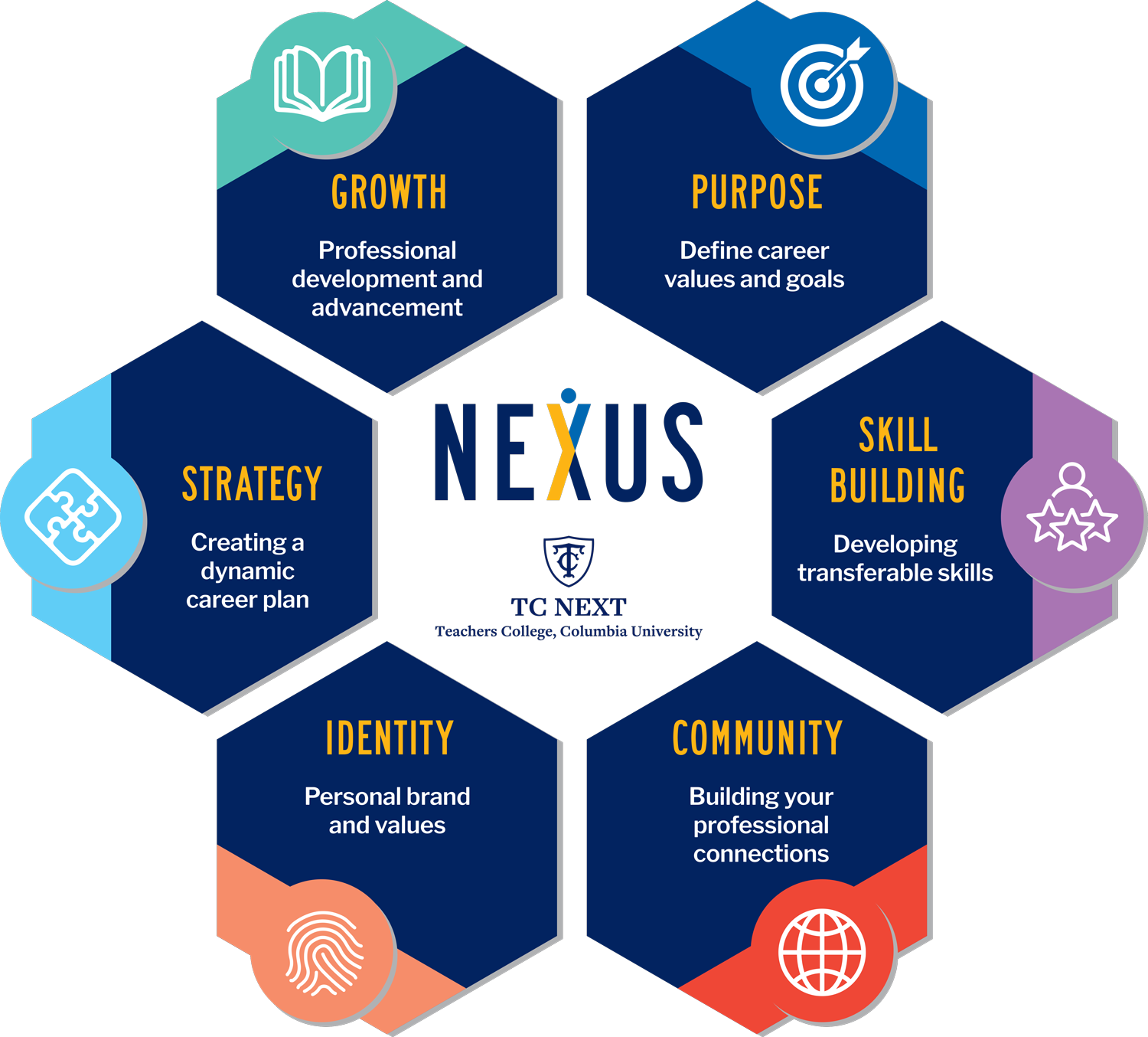 TC NEXT operates on a research-based, theory-informed approach to graduate career services known as the NEXUS. Encompassing a wide range of professional experiences and needs, NEXUS is a non-linear model created for students and alumni to engage, within our channels, where they feel most comfortable and ready. All TC NEXT programming and services are created to support individuals’ development in one or more of the six elements of the NEXUS, including Community, Strategy, Growth, Purpose, Identity, and Skill Building.